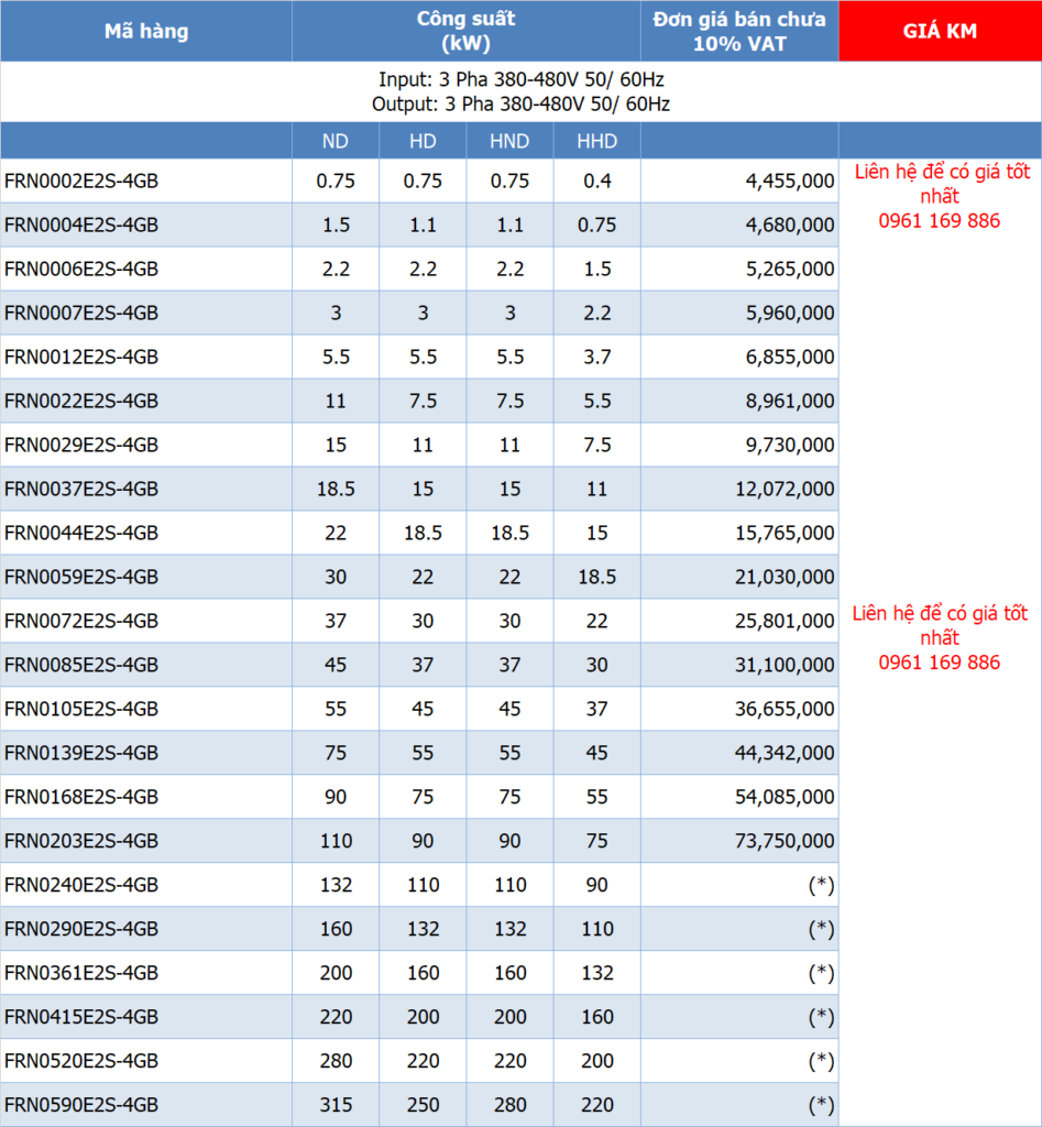 (Bảng giá chưa bao gồm 10% VAT. Sản phẩm biến tần FUJI Bảo hành 12 tháng theo quy định của nhà Sản xuất)
