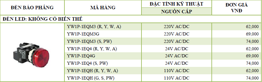 BẢNG CHỌN MÃ HÀNG - ĐÈN BÁO PHẲNG, KHÔNG BIẾN THẾ