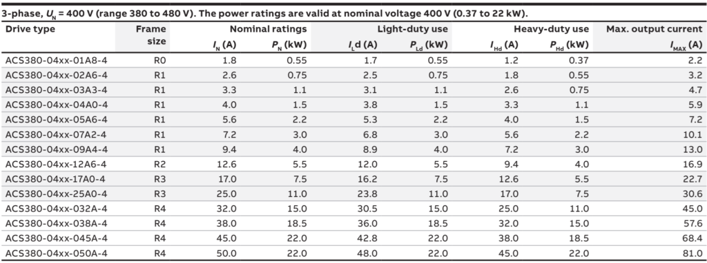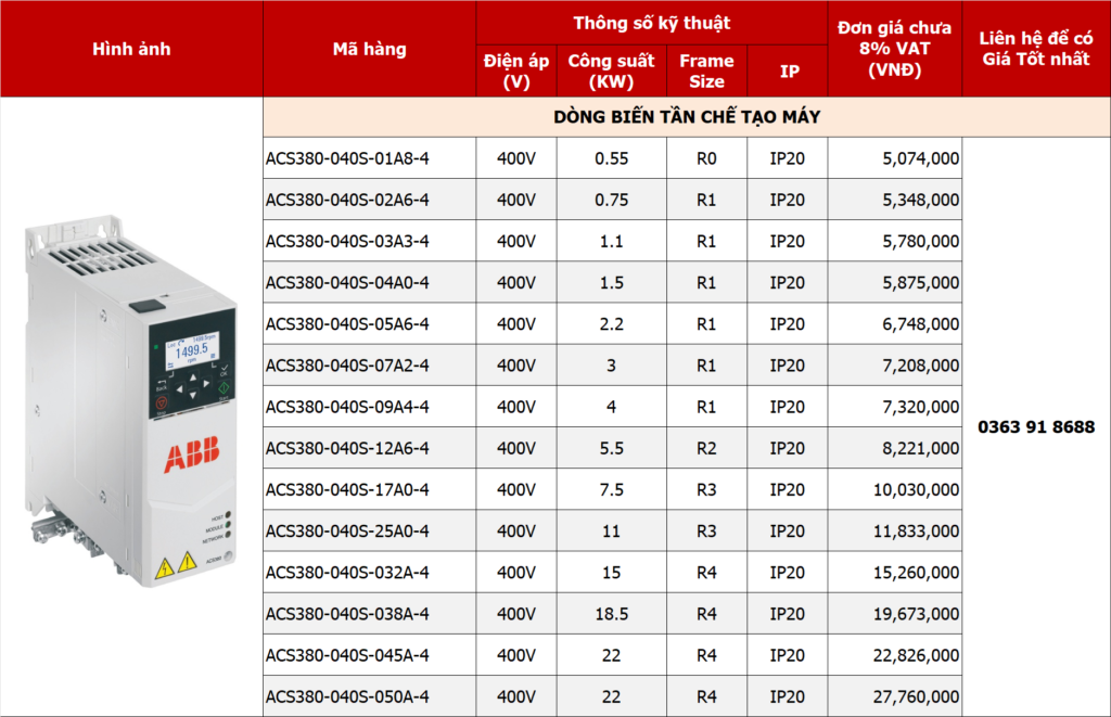 Thông số kỹ thuật: ACS380 3P 380V 3kw ACS380-040S-07A2-4
