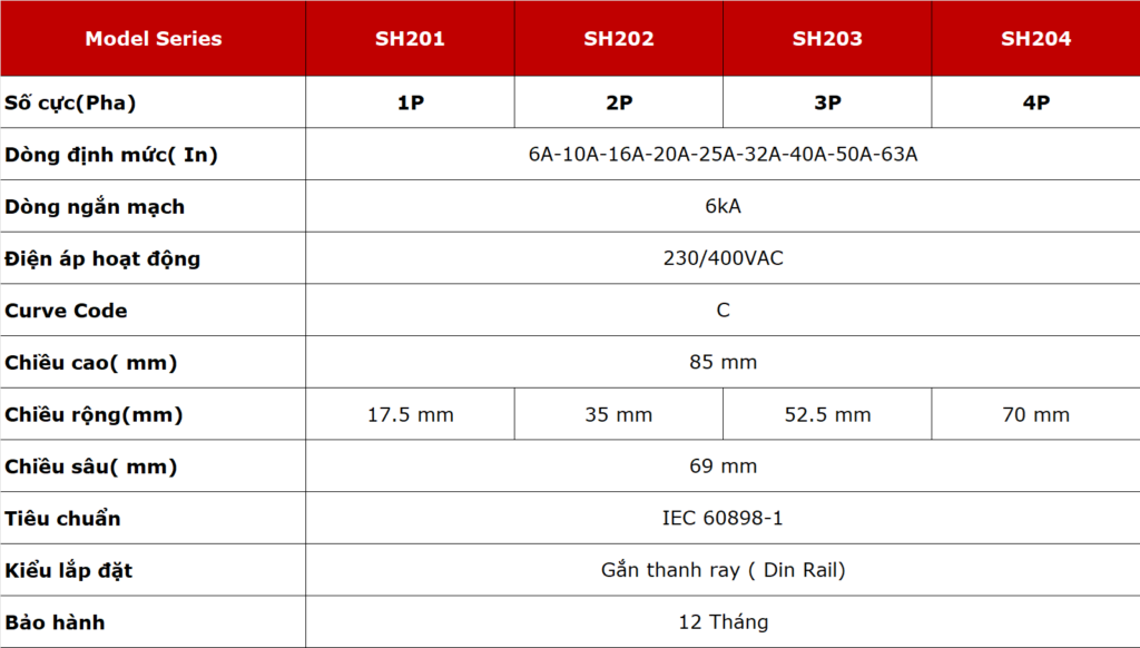 - Thông số kỹ thuật Attomat MCB SH202 2P 6kA 6A~ 63A