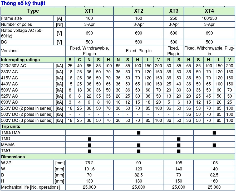 – Với trip từ nhiệt: từ 0.7 – 1In với dòng định mức từ 1A … 250A