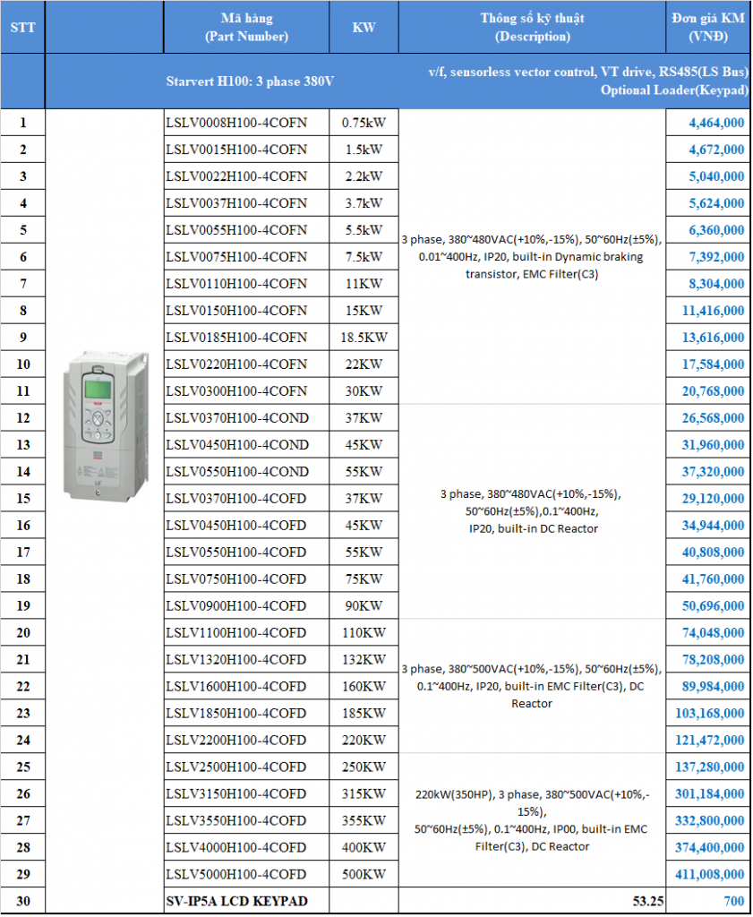 BẢNG CHỌN MÃ HÀNG - Biến tần H100 3P 380V 15KW LSLV0150H100-4COFN