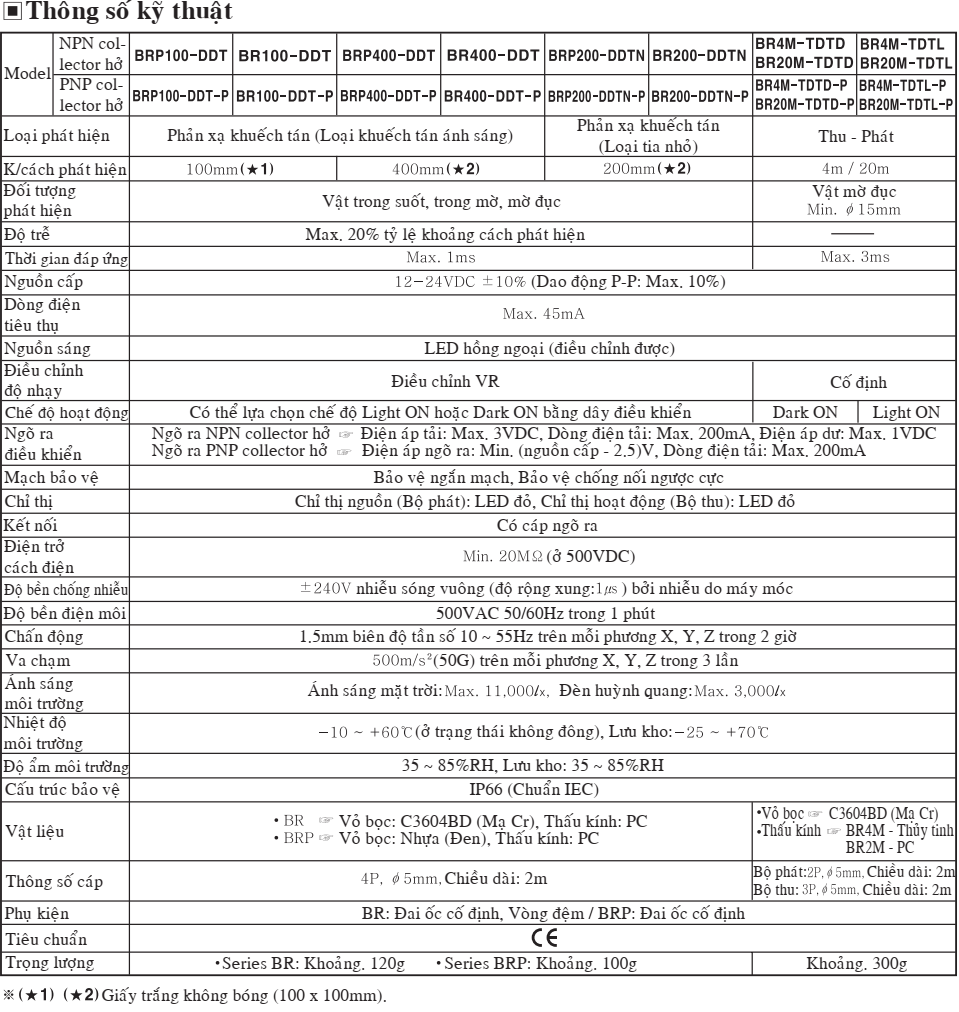 *) Thông số kỹ thuật Cảm biến quang BR400-DDT