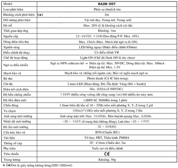 Bảng thông số chi tiết – Cảm Biến Quang Điện BA2M-DDT