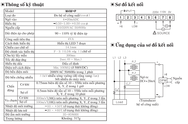 Đồng hồ đo hệ số công suất M4W-P hiển thị hệ số công suất bằng LED 7 đoạn, ngõ vào: 4-20mADC (Thông số ngõ ra của Transducer hệ số công suất).