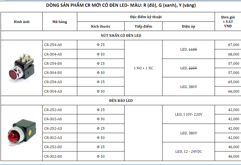 BẢNG CHỌN MÃ HÀNG Nút nhấn có đèn : CR-254A0Y